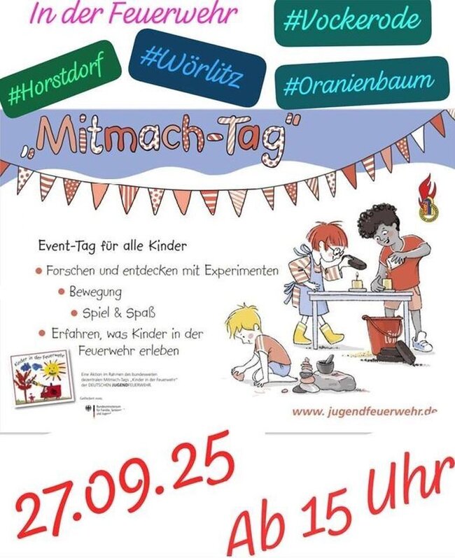 Ab 15:00 Uhr bieten die Feuerwehren in Oranienbaum, Vockerode, Horstdorf und Wörlitz ein abwechslungsreiches Programm mit spannenden Experimenten, Spielen und weiteren Aktivitäten.