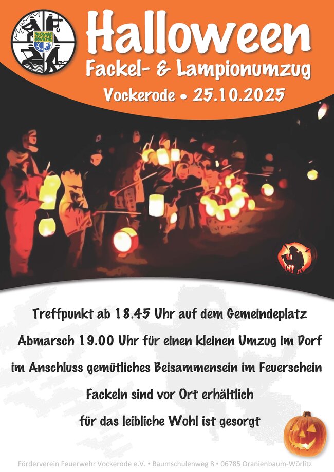 Der Förderverein der Freiwilligen Feuerwehr Vockerode lädt zum Halloween Fackel- & Lampionumzug ein. Abmarsch ist um 19:00 Uhr auf den Gemeindeplatz in Vockerode.