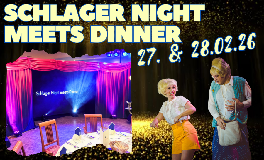 Wir nehmen Sie mit auf eine Reise durch die goldene Schlagerwelt der letzten Jahrzehnte. Erleben Sie eine amüsante und freche Schlagershow – Ein Ausflug mit dem „Knallroten Gummiboot“ bis alle „Atemlos“ sind. Eine Partynacht voller Überraschungen umrahmt von einem 4-Gänge Menü. Erleben Sie einen Abend den Sie so schnell nicht vergessen.